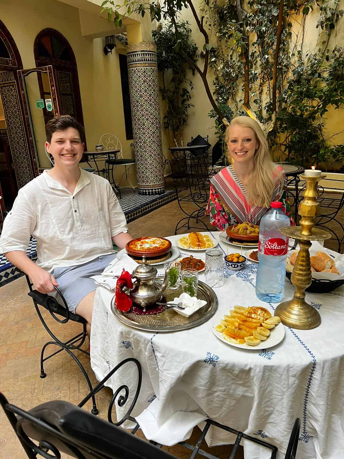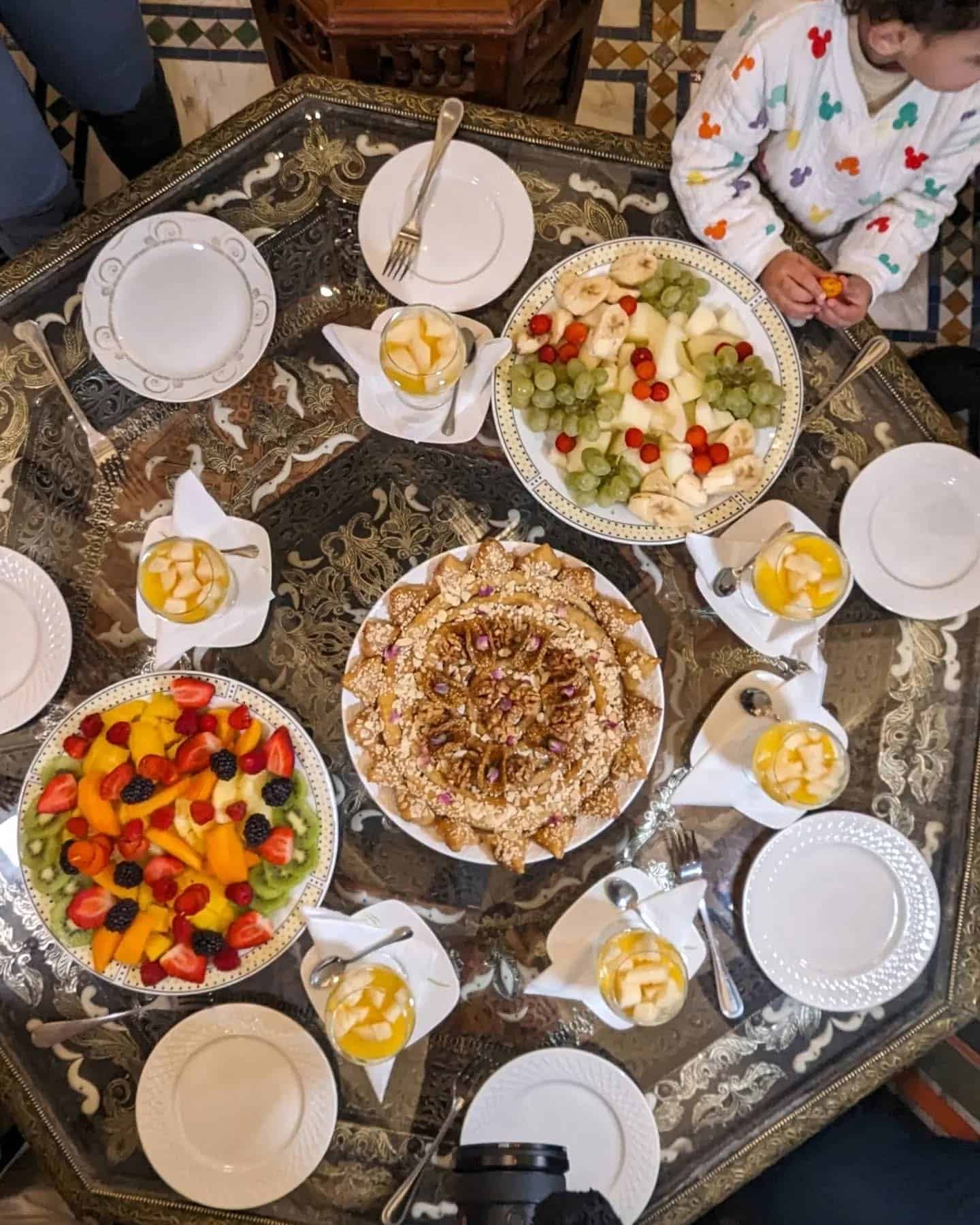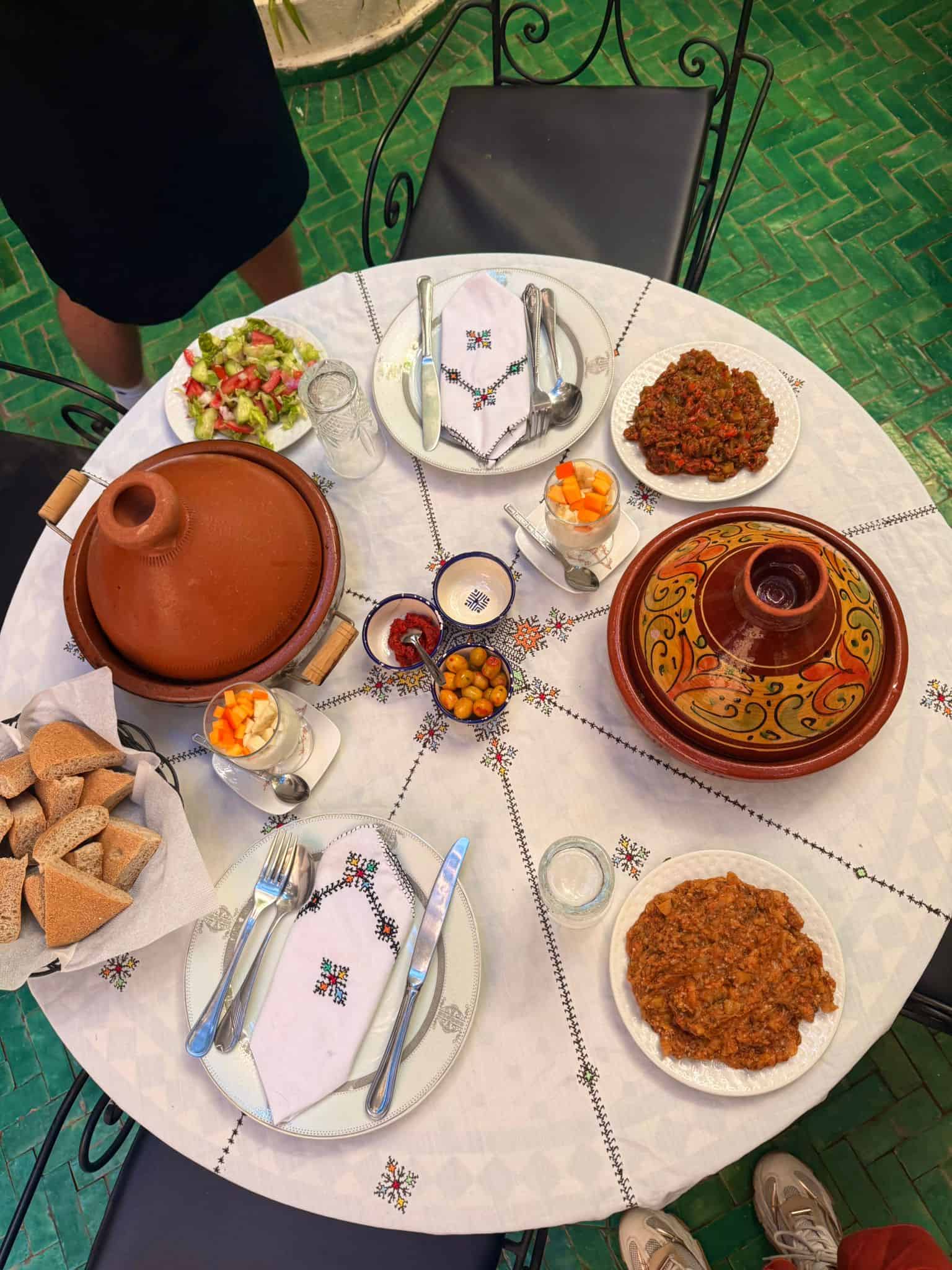 Step into a traditional riad in Fes, where the table is set with warm bread and authentic Moroccan dishes